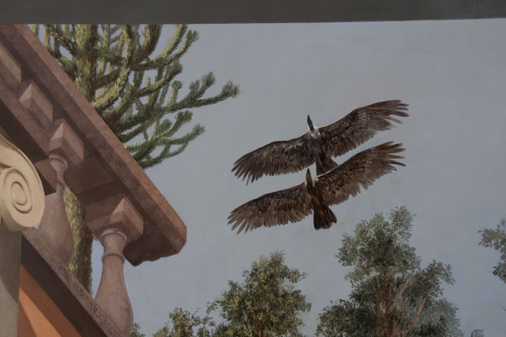 Le tryptique est une allégorie des trois règnes (animal, minéral, végétal) peinte en trompe-l'œil. L'axe de vision idéal se situe sous l'œuf d'autruche suspendu à la croisée des structures de la verrière ; il s'agit du point précis d'où chaque volet est vu à égale distance par le spectateur.